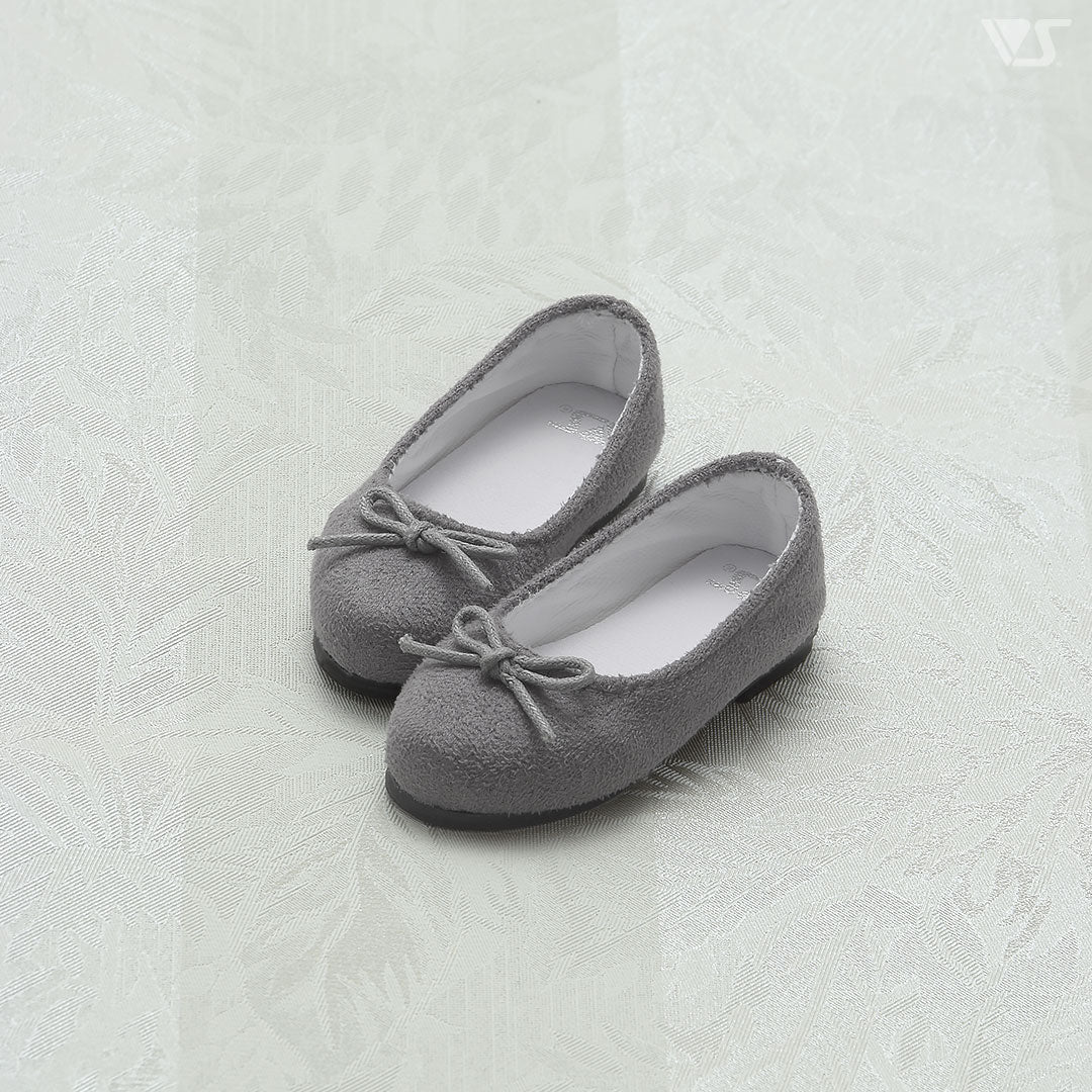 A pair of shoes made of smooth suede-like material with a cute ribbon.
